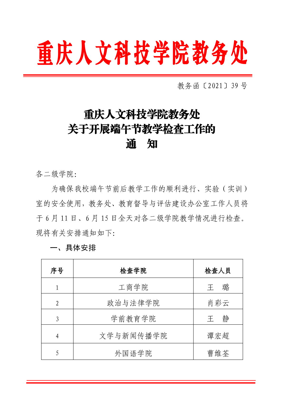 关于开展端午节教学检查工作的通知