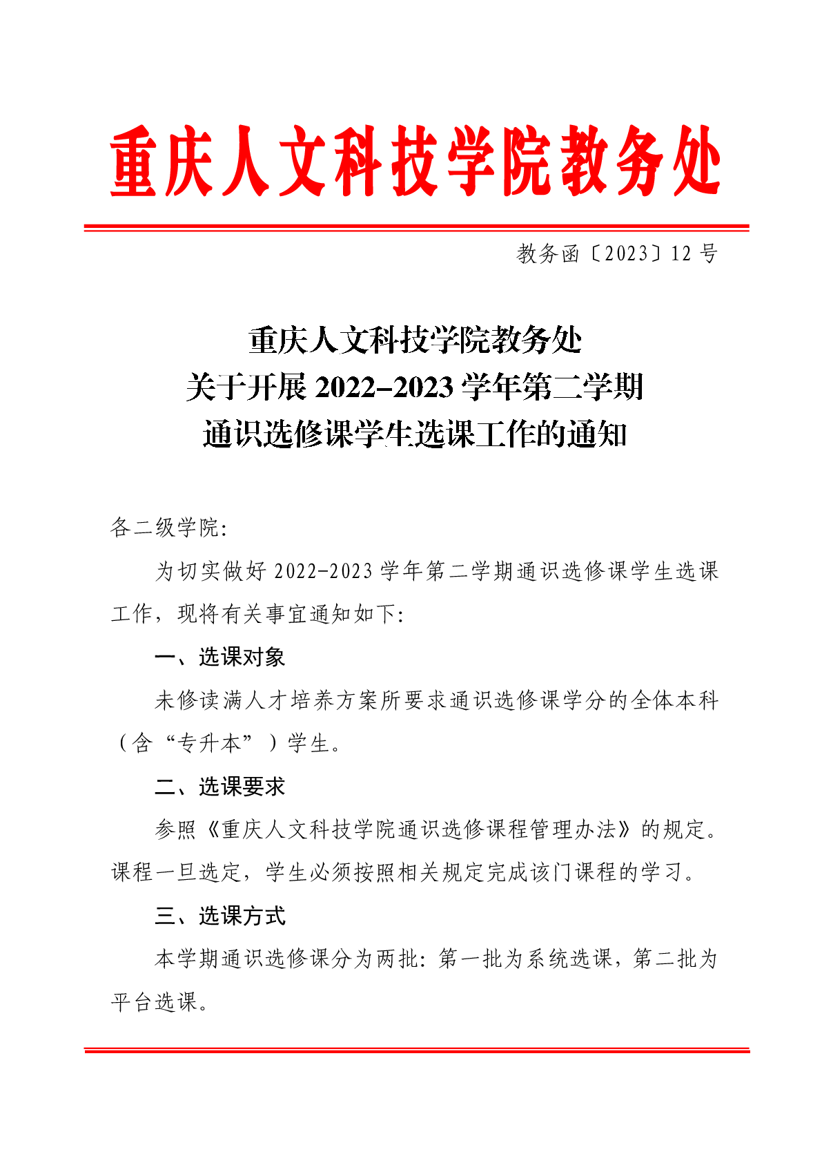 必赢3003no1线路检测中心关于开展2022-2023学年第二学期通识选修课学生选课工作的通知