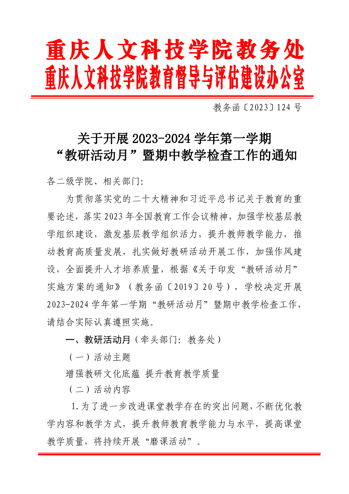 关于开展2023-2024学年第一学期“教研活动月”暨期中教学检查工作的通知