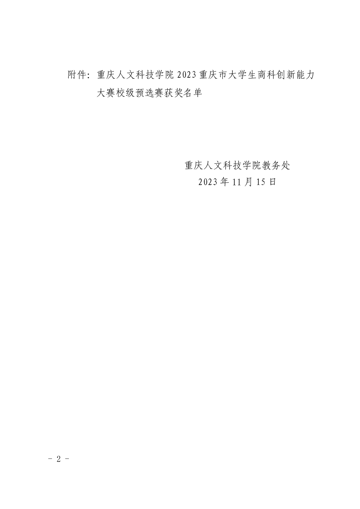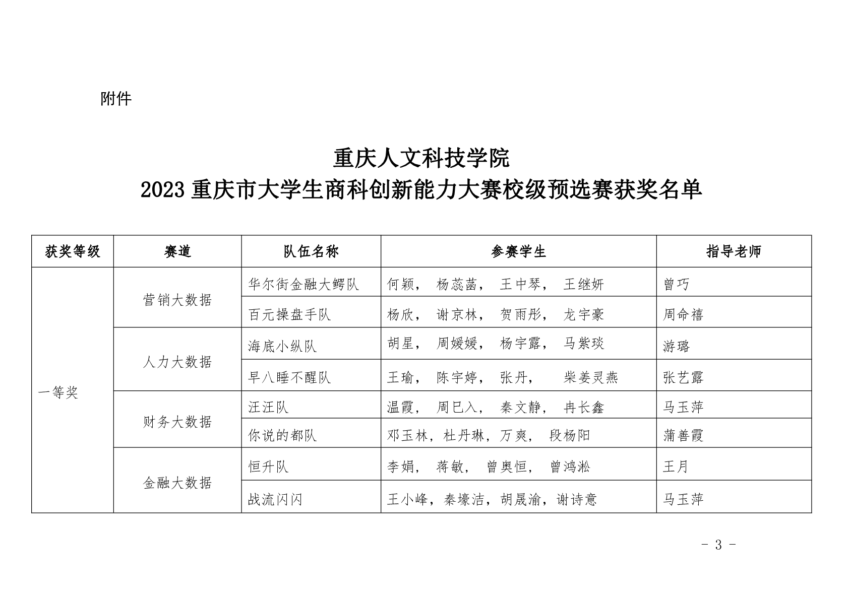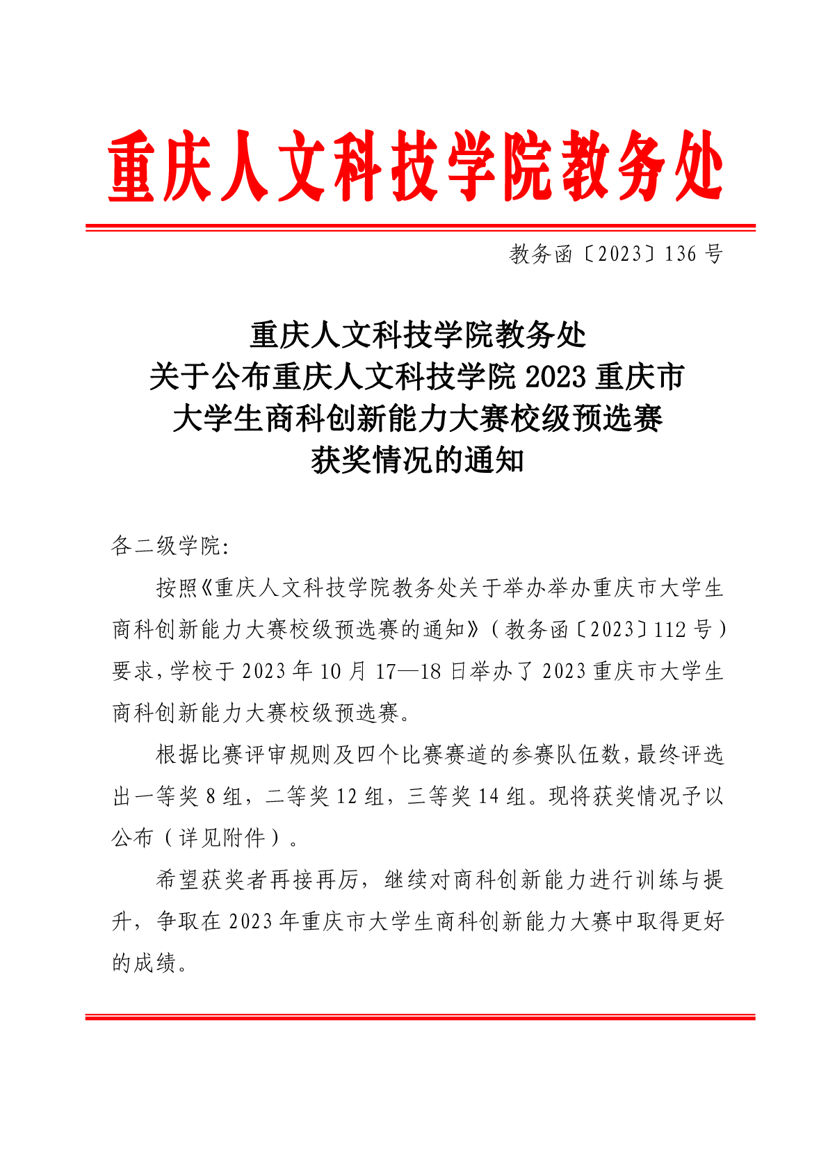 必赢3003no1线路检测中心关于公布重庆人文科技学院2023重庆市大学生商科创新能力大赛校级预选赛获奖情况的通知