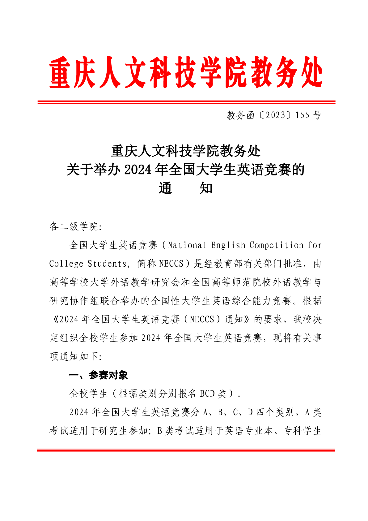 必赢3003no1线路检测中心关于举办2024年全国大学生英语竞赛的通知
